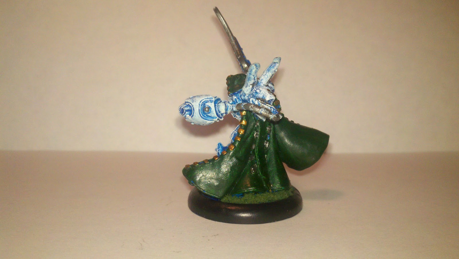 So back to the painting itself, I used a green on the cloak and gold/silver for different accents on the model. As you can tell from the pictures, I need to work on the face detail, but I currently lack a brush that would allow me to put any detail into that part of the model. I really like how the model turned out other than the face. I like how intricate the model was created by Privateer Press, and I think this is probably my favorite looking Ret caster.